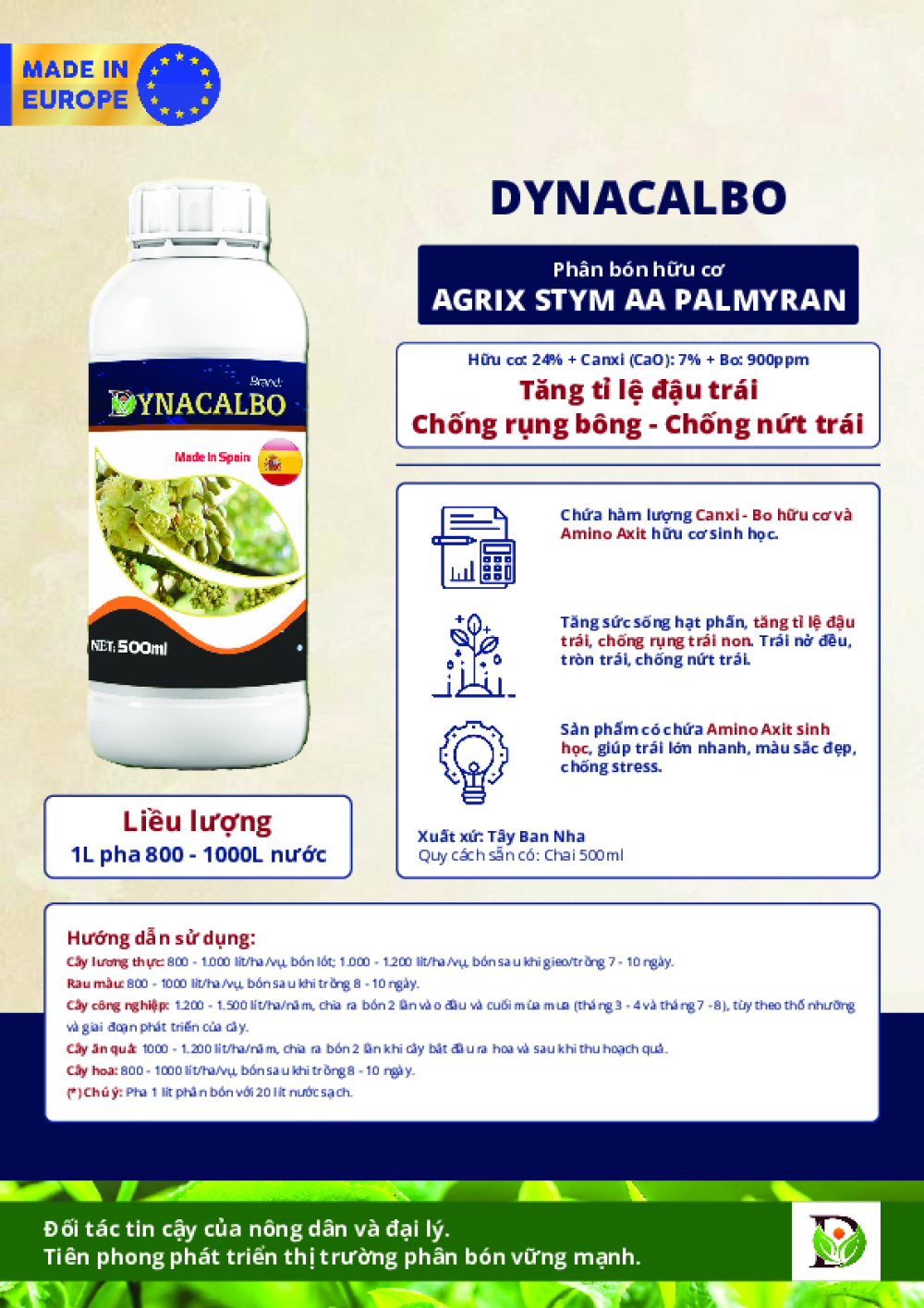 Thông tin sản phẩm: Phân bón Dynacalbo là sản phẩm chuyên biệt giúp tăng cường sự phát triển của cây trồng, đặc biệt là trong giai đoạn ra hoa và phát triển trái. Với thành phần canxi, bo hữu cơ và amino axit sinh học, Dynacalbo mang đến một giải pháp hiệu quả để nâng cao tỉ lệ đậu trái, chống rụng bông, rụng trái non và nứt trái. Sản phẩm được sản xuất tại Tây Ban Nha, đảm bảo chất lượng cao và hiệu quả tối ưu cho cây trồng.