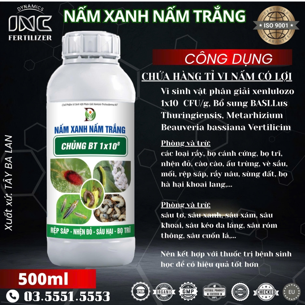 Nấm Xanh – Nấm Trắng Chủng BT 1×10⁸ là chế phẩm vi sinh sinh học cao cấp, chứa hàm lượng cao vi sinh vật có lợi, chuyên dùng để phòng và trừ sâu hại, côn trùng gây hại trên cây trồng theo hướng an toàn – thân thiện môi trường.